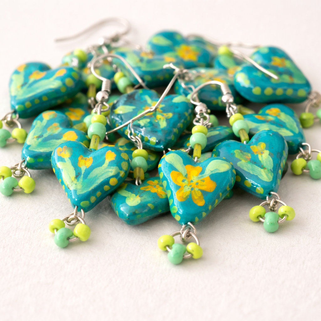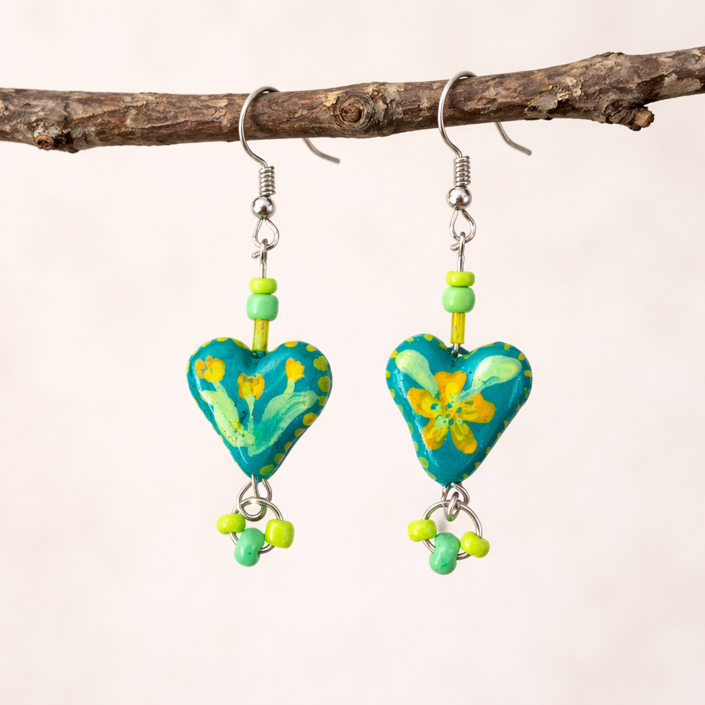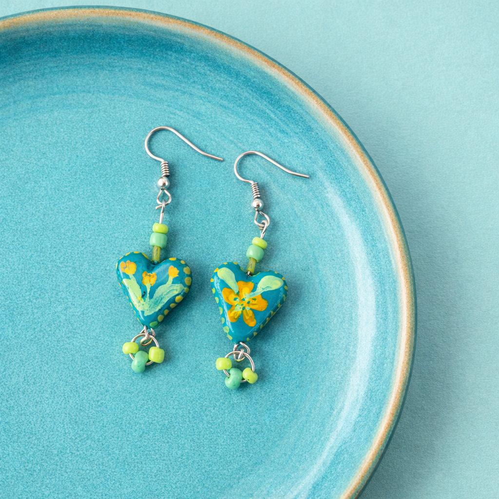 A bold and expressive pair featuring handcrafted clay charms, beads, and sequins—made to stand out yet stay wearable for both festive and casual outings.